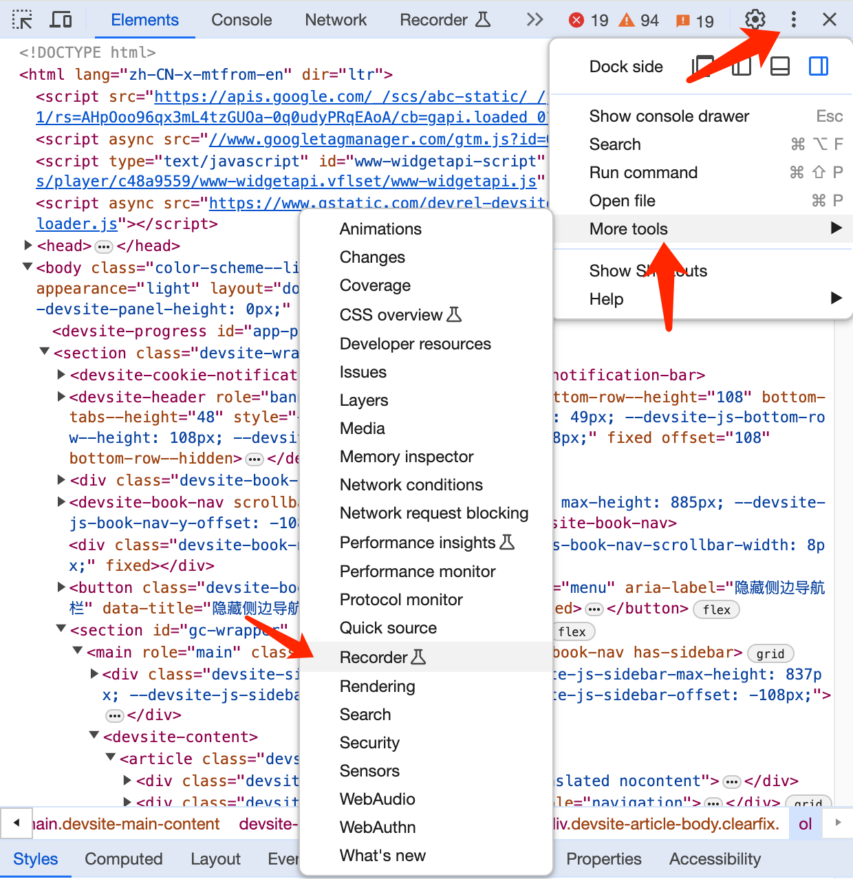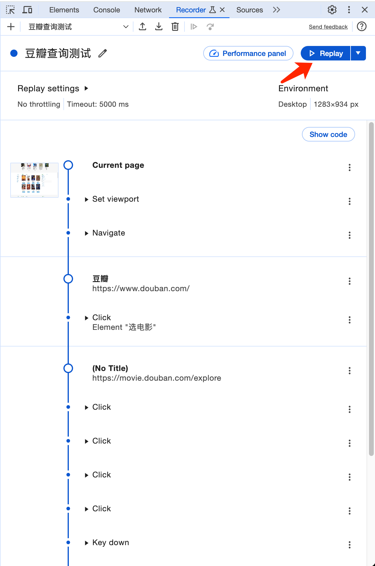 Right-click on the Douban homepage and select the last item Inspect , then the Google Chrome developer tools will open. The developer tools will open the Elements panel by default, and then select More options, More tools, and Recorder from top to bottom according to the following picture