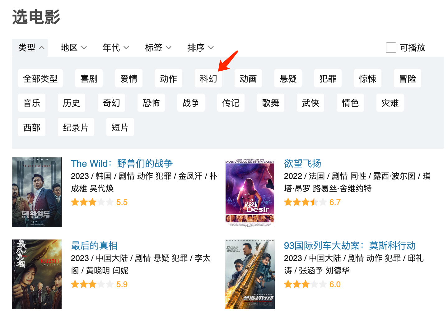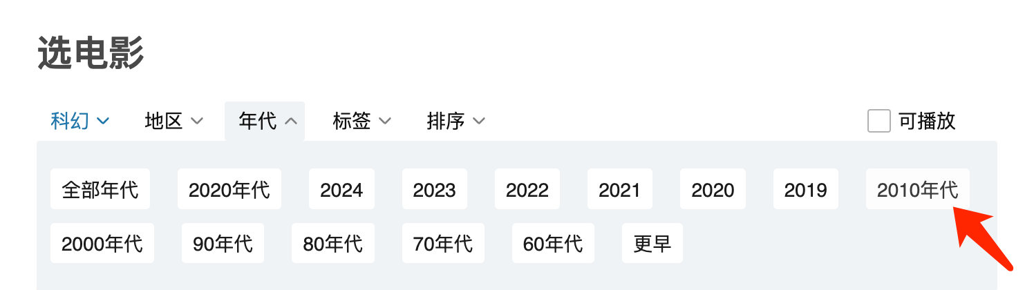 Next, we click on the following icons in turn (select Movie->Type (Science Fiction)->Decade (2010s)):